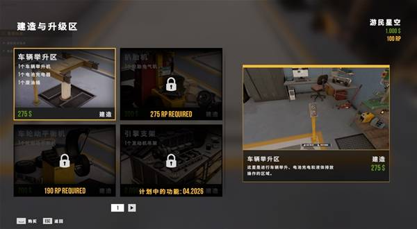 选择车辆举升区以后鼠标单击长按或者空格长按购买,后续还可以建造扒胎机和车轮动平衡机。