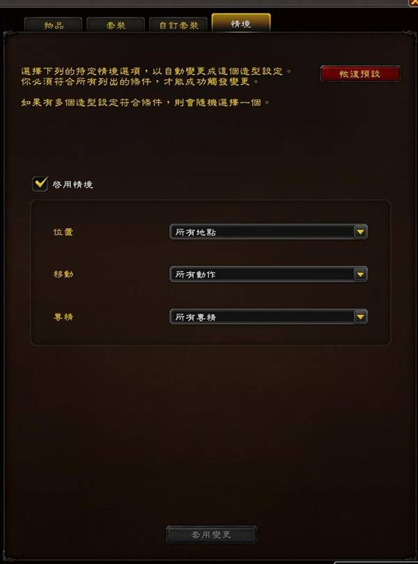 最后就是这个系统的第二个亮点,每个塑形方案可以依据所在场合自动切换成的前面储存的外观方案。