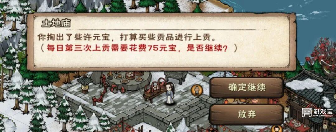 (6)土地庙,上贡。第一次免费,元宝可以上贡4次。每次25,50,75,100元宝,每次可获得50烟雨钱。氪佬可以拉满,平民非常建议拉两~三次,庙会部分道具比元宝值钱。