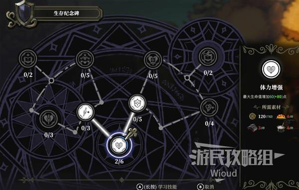 技能树需要在村庄设立纪念碑解锁,前期可解锁“战斗技能树”与“生存技能树”。