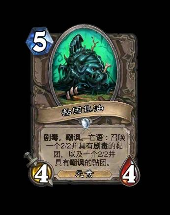 改动后:[法力值消耗5] 4/4。亡语:召唤一个2/2并具有剧毒的黏团,以及一个2/2并具有嘲讽的黏团。