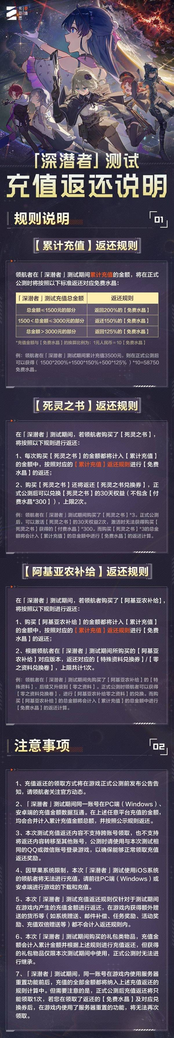 领航者在测试期间累计充值的金额,将在《卡厄思梦境》国服正式公测后,按照以下规则返还至参与测试的同一QQ或微信账号下。 领航者可查看「深潜者」测试充值返还说明以了解具体信息。