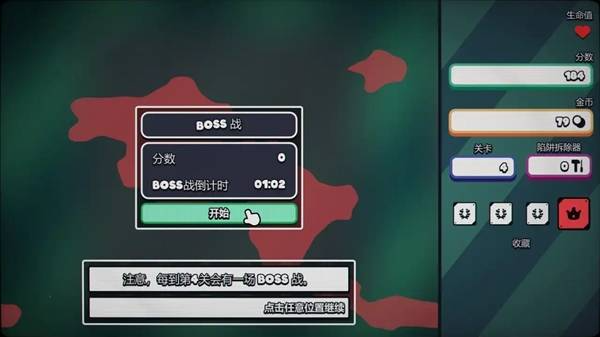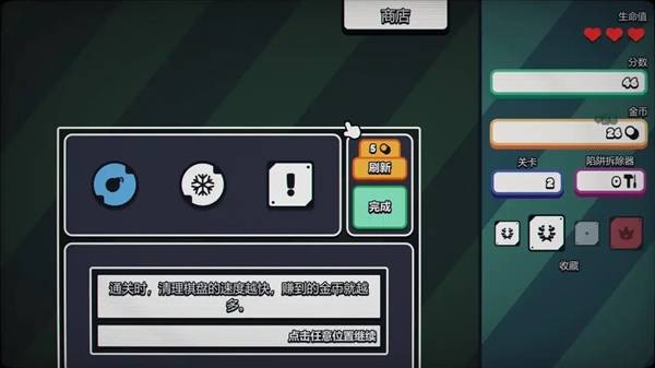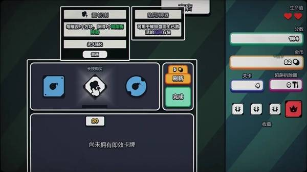 战术运营的加入,更让游戏的策略深度上了一个台阶。不同于传统扫雷只追求速度,本作中则是充分体现了一句谚语:“时间就是金钱”—通关越快,获得的金币越多,而金币又决定了你能否在商店买到心仪的卡牌,然后赢得boss战的胜利。是选择前期过渡性强化稳扎稳打,还是攒钱all in赌一波卡,毕竟争分夺秒的Boss战可是非常难应对的!