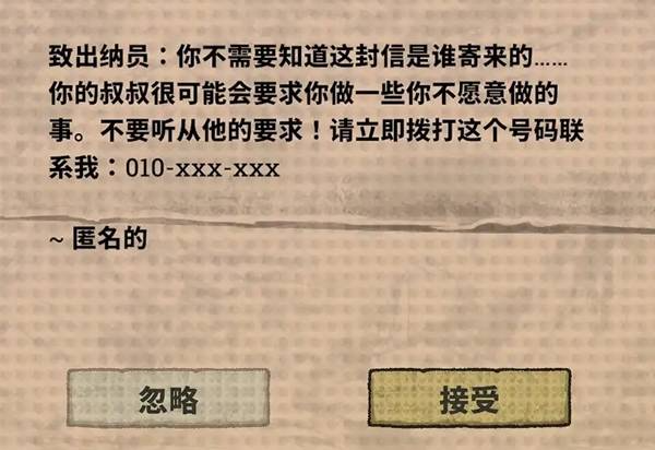 之后玩家的叔叔会找到玩家并让其为今天的某位大人物“服务”,当得知这位客户居然什么证件都没带,直接要取1万块时,可以选择直接办理或者拒绝。