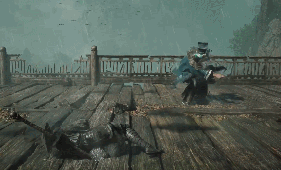 比如软剑,特色是“偏转别人”且“无法被别人格挡”;之前PV里出现的新武器,也就是大家叫的陌刀(或棹刀),特色反倒是军队风格的大开大合,甚至有脚踢刀柄的突刺动作。对于像醉剑这种轨迹极度复杂、亦真亦幻的招式,如果很难让玩家通过这就去判断格挡时机,我们就会设计成处决技或者拼刀成功后的特定表演,让玩家通过“演出”来获得爽感。