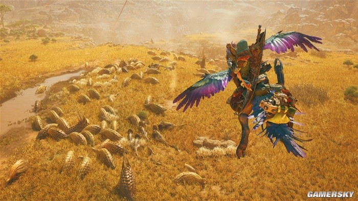玩家在地图界面可以随时接取狩猎任务,接取任务后可以自由无缝的前往原野区域寻找猎物,进行狩猎。在这个过程中,玩家们可以随时吹哨召唤新的坐骑鹭鹰龙。鹭鹰龙有着比《怪物猎人:崛起》里狗狗更高的机动性,能在空中进行短距离的滑翔。骑乘时,玩家可以选择让其自动前往目的地。