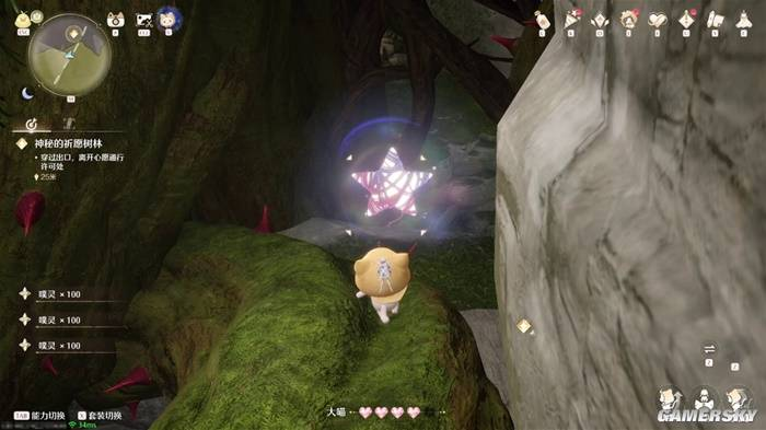 但服装也不只是作为一种采集工具出现,随着游戏流程进行,新的能力套装也带来了不同方向的变化。例如,当玩家需要进入祈愿树林时,具有变小能力的“迷你星芒”套装可以让暖暖变小,这时玩家会转而操作大喵,让它驮着暖暖来探索那些狭窄逼仄的秘境。这很可能就是“能力套装”在后续更新中主打的定位——一种新的探索世界的方法,而不断寻找这些服装,乃至最终获得奇迹套装,就是暖暖在这片大陆上旅行的意义。