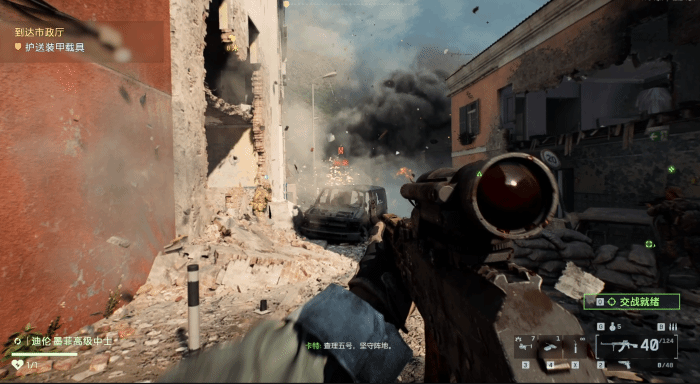 成功登陆后,便进入了一段漫长的步载协同巷战过程,埋伏在楼宇之间的敌人会用拖式飞弹和RPG来对己方步战车造成威胁,我们作为步兵一方面需要及时清理掉这些火力点,同时还得肩负起反坦克和修车的任务,在我所体验的老兵难度下确实能体会到很强的压迫感。