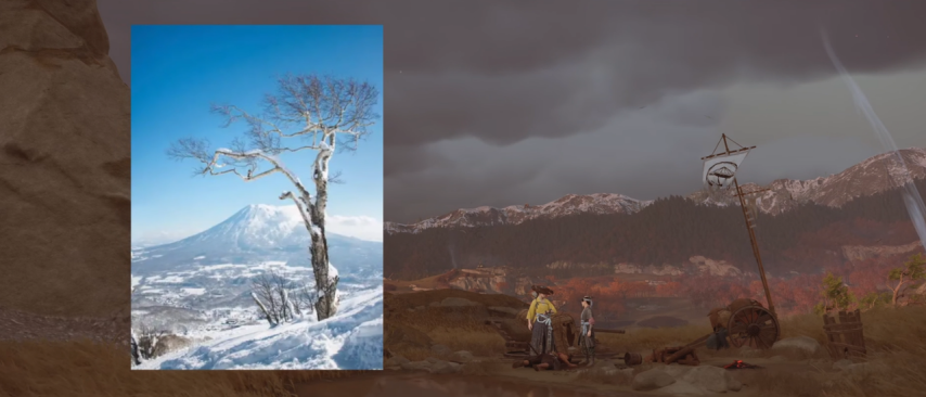 游戏中的羊蹄山取材自日本北海道的真实山脉,诸多经典日式视觉元素都能在游戏里找到。比如素有“虾夷富士山”之称的羊蹄山、日本原住民的传统聚落、常有狐狸出没的神社,以及游走于大地之上的浪人与武士。
