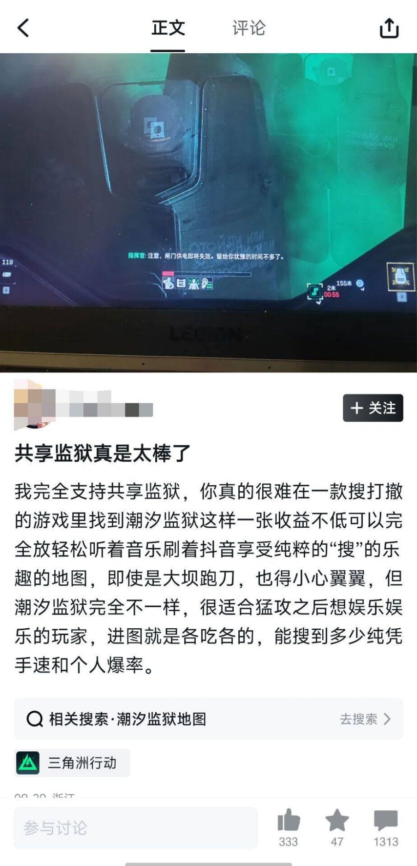 再加上《三角洲》目前泛滥的护航产业,导致正常玩家在对局中经常遇见实力远超自己的护航队,其中甚至还有开挂的。高压体验让玩家迫切地想找个能喘口气的地方,共享监狱一出就正好顺应民意。