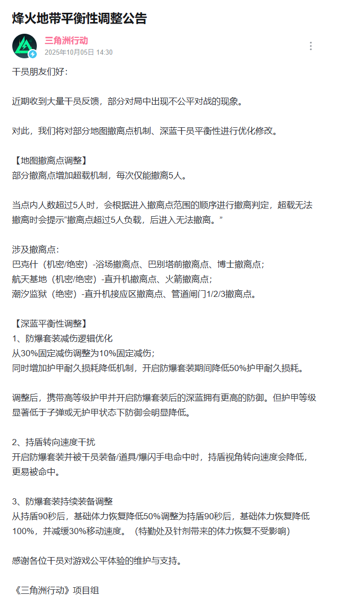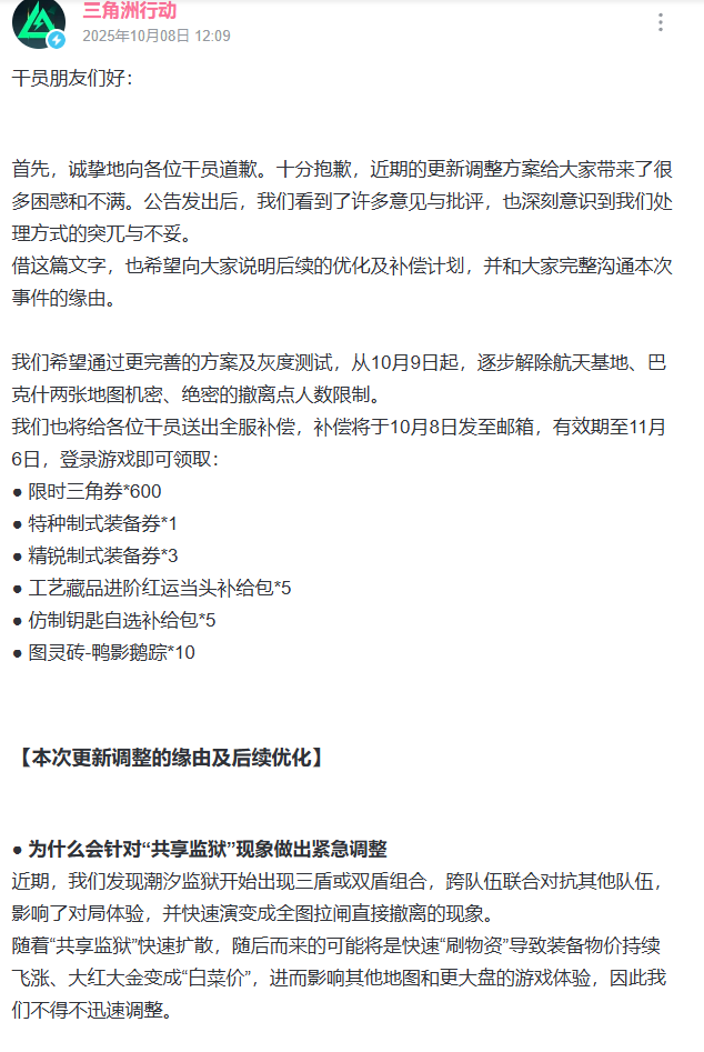 起因就是《三角洲》官方在10月5日发出的公告,涉及干员平衡性改动和撤离点机制改动,但看似平平无奇的公告其实“暗藏祸心”——公告发出后,社区内立马哀鸿遍野:共享监狱干不下去了,大家都散了吧……