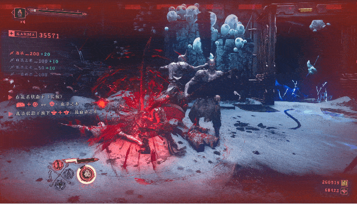 但我想大家应该都会更喜欢它在“乱杀模式”中的表现。本作新加入的“乱杀模式”,类似《战神》的“斯巴达之怒”,通过同时按下左右摇杆即可开启,绝对包爽。该模式下,使用奴延鸟之型的特定攻击,即可直接“血杀”(秒杀)除Boss以外的所有敌人,血杀时还会有张力超强的特写镜头+切字演出。在乱杀模式结束前,玩家还可以随时再次按下左右摇杆,施展一次范围更广的终结血杀攻击。