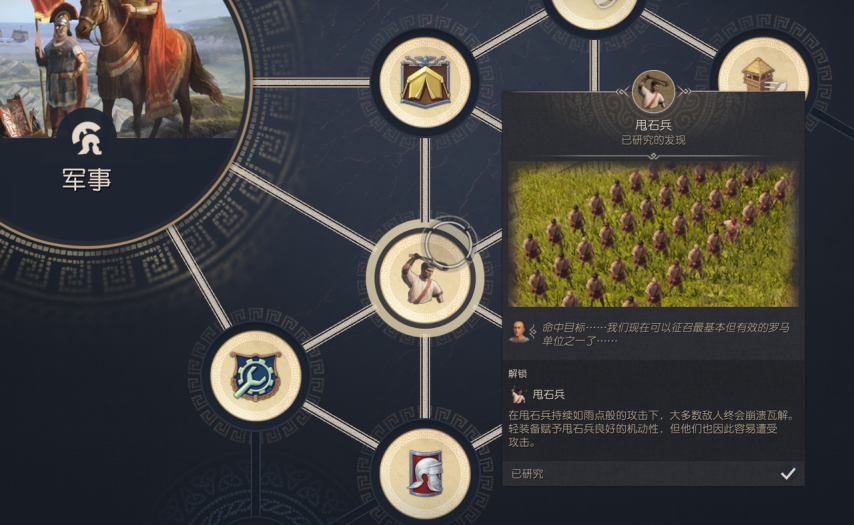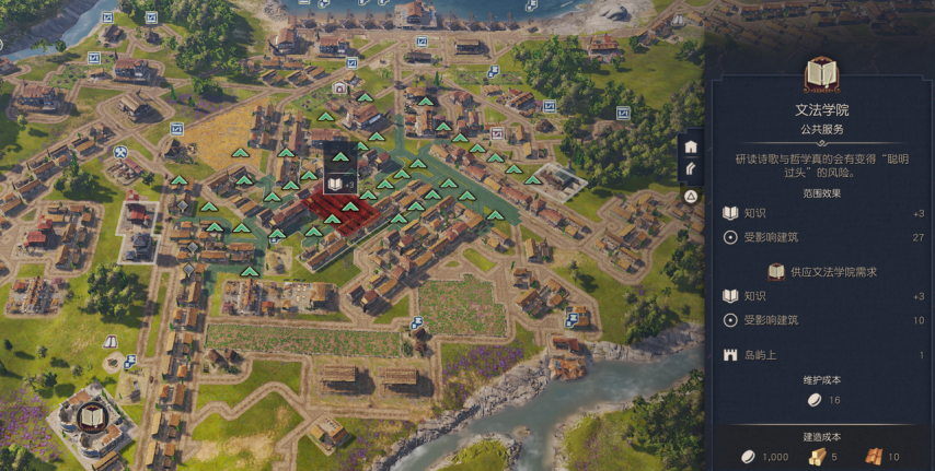 本作的科技树分“经济、公民、军事”三大方向,需先建立文法学院等建筑,并用学园提供的“知识”解锁。有的科技提供 Buff,有的解锁新建筑,且研究都需要花费一定时间。看这星罗棋布的科技树,就知道这游戏我前几小时也不过是刚玩了个开头而已。