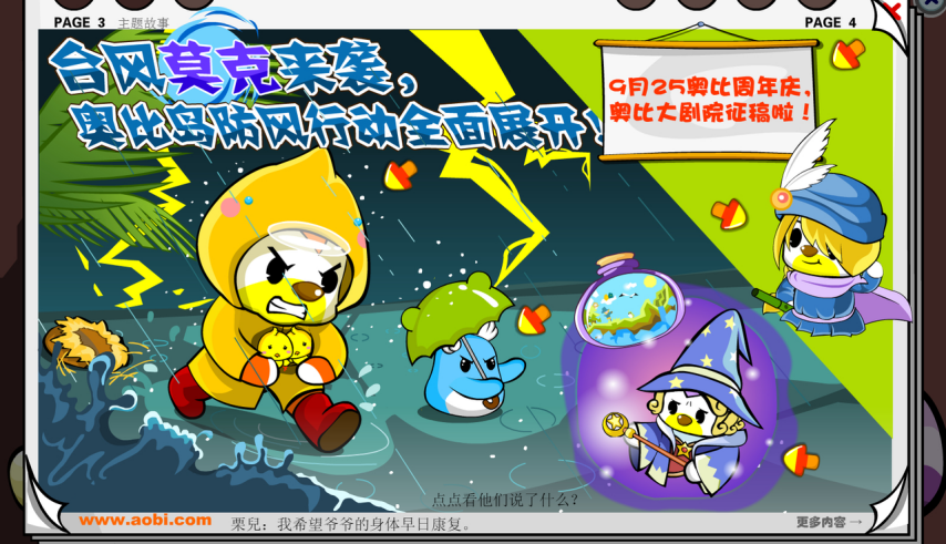 此外,奥比岛还注重与现实社会的连接。例如2009年超强台风“莫拉克”登陆中国时,游戏内不仅上线了相应的防风主题任务,多个场景地图也配合现实事件进行了临时调整,增强了游戏世界的真实代入感。