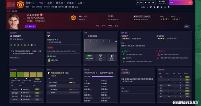 往年《足球经理》一贯采用的是使用左侧导航菜单+顶部多标签页的模式,而这一代则去掉了左侧导航,转而使用了顶部导航和下方的子菜单,并且在页面上添加了大量卡片,打造出了一个更接近仪表盘风格的卡片式布局。