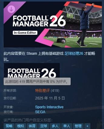然而现实总是事与愿违。在Steam上正式发售后,《足球经理26》所获得的只有来自各方的批评声,而它们则化作了低至22%的“多半差评”,与国区玩家仅5%的“差评如潮”(计算统计至截稿时,包括Steamkey评测的中文好评率为3%)。你很少能见到国区玩家的差评和全球用户如此出奇地一致。