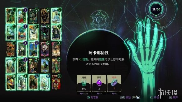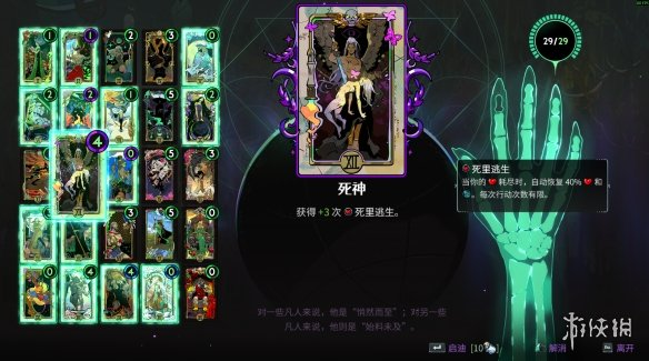 针对这个玩法,还有一个在我眼中相当有趣的点,那就是玩家不可能在开局就携带所有阿卡纳牌,因为0悟性的卡牌需要特殊条件激活,其中便有一些对于携带数量有所要求。因此在局外卡牌安排上的流派也远不止一种,这让我感到相当欣喜。