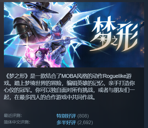 《梦之形》是一款结合了MOBA风格的动作Roguelike游戏。踏上梦境世界的冒险,编辑英雄的记忆,亲手打造你心仪的冠军。你可以独自面对所有挑战,或者与朋友们一起,在最多四人的合作游戏中共同作战。
