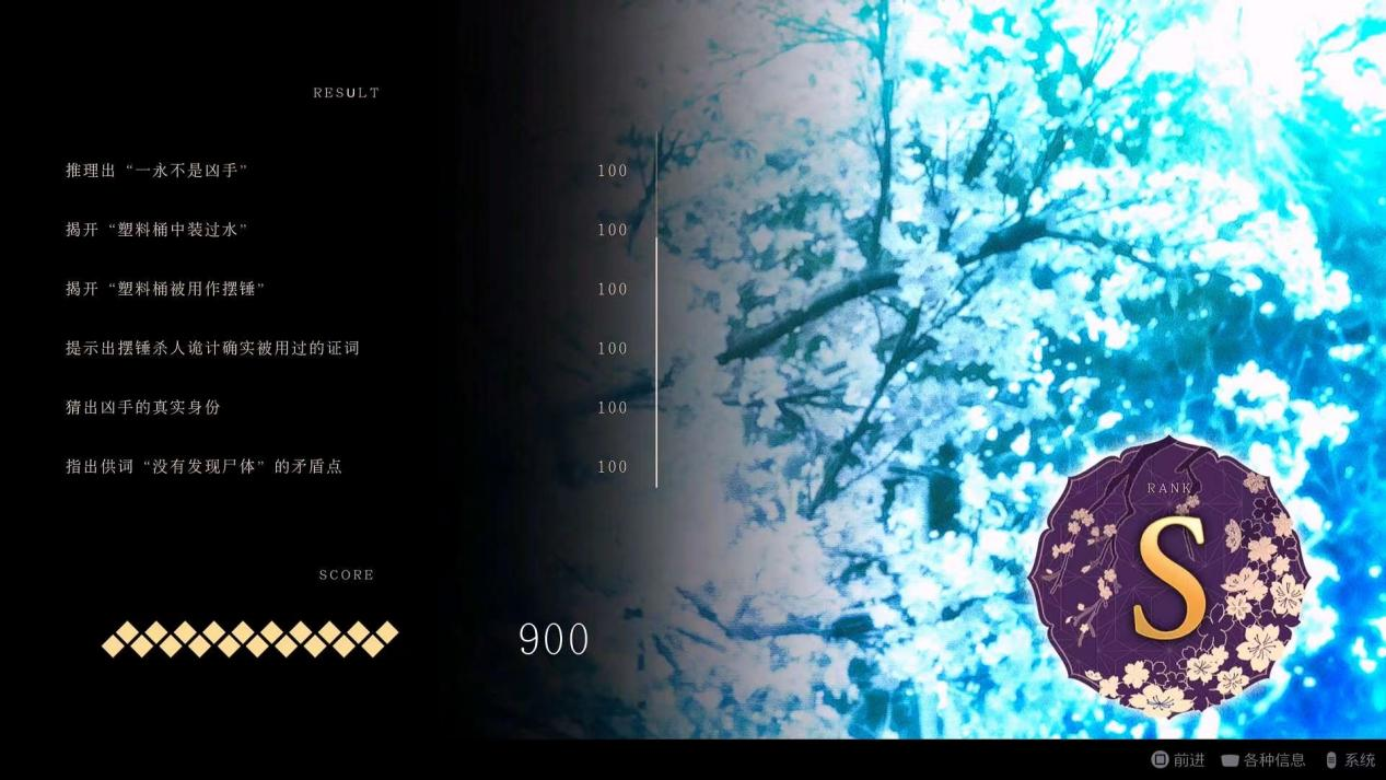 当你完成整个章节的故事后,系统还会根据你在解决篇中犯错的频率,为你在该章节中的表现打分。全程不出错的话,就可以得到该章节的“S”评价,而中途但凡有一次失误,都会直接进入失败结局。这时,你可以回到推理篇重新来过,也可以选择获得提示直接“原地复活”,代价则是在章节评分时会被扣掉更多分数。
