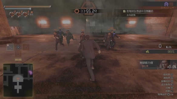值得称道的是外传《Dark Ties》。它不仅以峰义孝的视角精彩地补充了本篇剧情,其本身扎实的动作设计、荒诞与黑暗完美融合的叙事基调,以及“地狱生存战”等特色玩法,都使其成为了一份独立而优质的体验,甚至在趣味性和氛围营造上超越本篇,使得这个合集有着主次对调的意思。