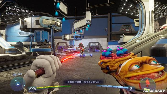在所有“加特林人”中,我最喜欢的一把名为“怪物”。这把枪的攻击方式不是射出子弹,而是投掷出一堆微型的“小怪物”……也就是它的孩子。这些小家伙落地后会四处乱窜寻找敌人攻击,而玩家可以用右键发射激光笔指挥它们移动。指向敌人时,这些小怪物就会蜂拥而上去撕咬目标,造成持续伤害。
