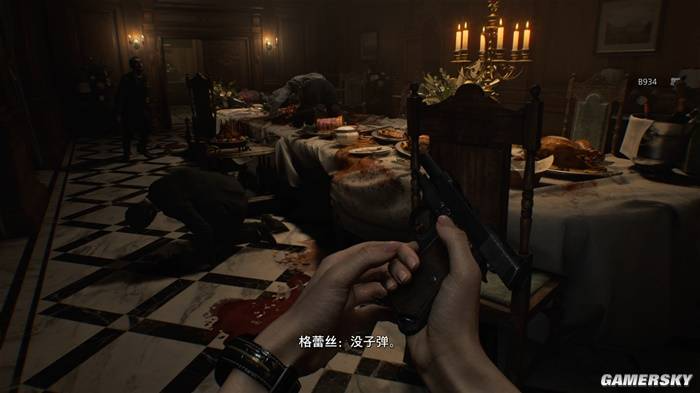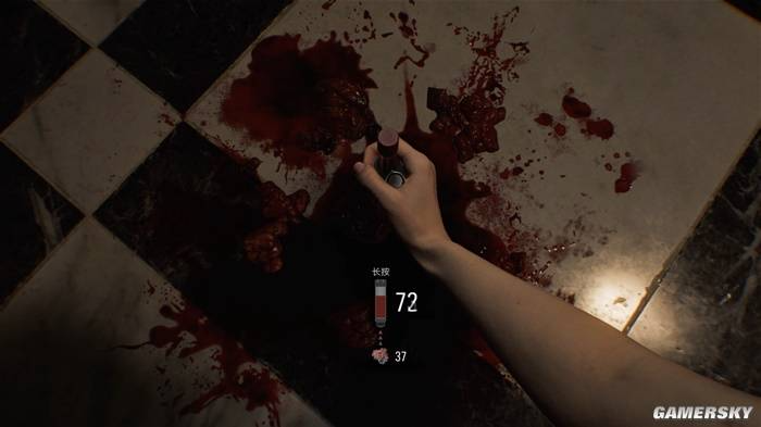 当然了,作为动作性能较弱的补偿,格蕾丝会在流程中得到名为“采血器”的神器。在关卡中,地上散落着不少血池或血桶可供采血器收集,丧尸死亡后也会流出少量的血液。
