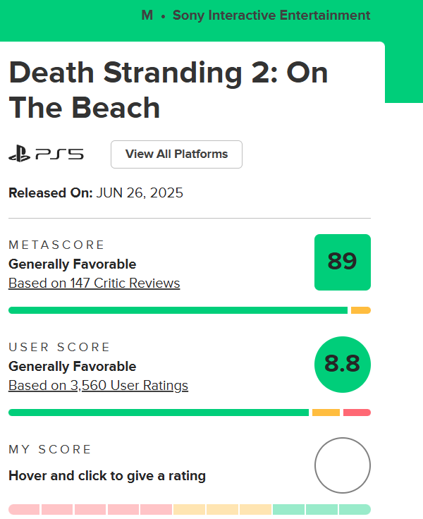 目前游戏在海外专业评测聚合平台稳居高分区间,推崇者将其视作游戏艺术与人文表达的天花板,诟病者则直指其节奏拖沓、内核重复。两种截然不同的评价,恰恰印证了它独一份的辨识度——这是一款只属于小岛秀夫,也只适配特定玩家的作品,没有中间地带,只有偏爱与无感的分明界限。