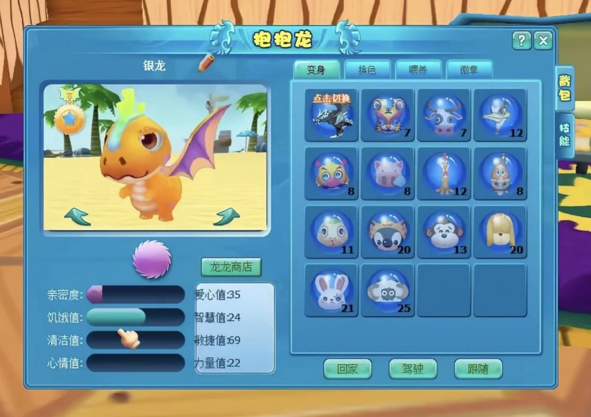 随着抱抱龙等级的提升,还可以解锁骑乘、飞行等功能。在当时,我最大的愿望就是赶紧把抱抱龙升到八级,然后骑着它把整个地图飞一遍。这种俯视角纵览环境、无拘无束的移动体验,对于2D儿童页游来说,是一种相当降维打击的存在。