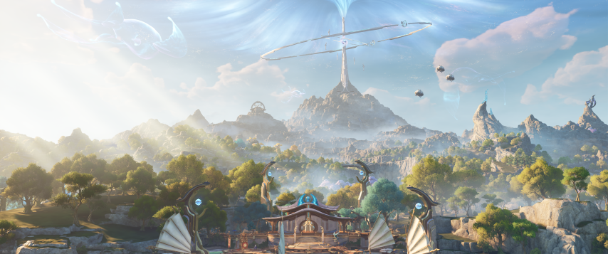 整张地图的建筑群气势恢宏,从依山而建的机关学宫到悬浮云端的观星台,远近景观层次分明、细腻生动,无论是标志性的通天塔,还是散落各处的卷轴与符文细节,都经得起推敲,强有力地展现了天美顶级的工业化水准,也彰显了对IP还原的极致追求。