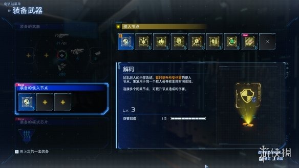 除了这些内容外,游戏中还有一个重要的强化手段,那就是为休装配模块。游戏中玩家最多可以获得6个模块槽,根据需要可以加入包括但不限于增加入侵强度或增加伤害之类的模块。为应对越来越强的敌人,挑选合适的搭配,尤为重要。